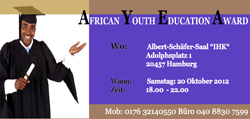 The 2nd African Youth Education Award is taking place in Hamburg at the Albert-Schäfer-Saal, “IHK” Adolphsplatz 1, 20457 Hamburg. The date is Saturday 20 of October 2012; the program begins at 18.00 – 22.00Organizers are grateful to the following institutions and people for their relentless assistance: